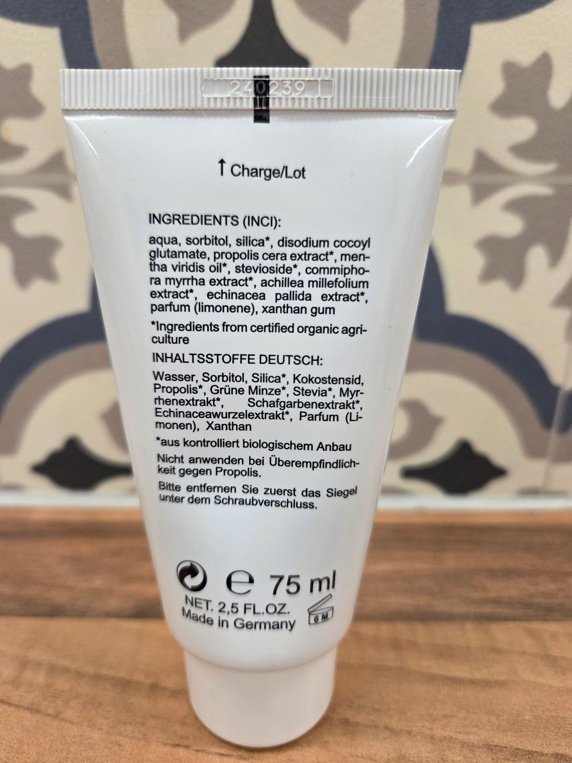 Gib deinem Mundraum eine natürliche Pflegekur mit unserer Propolis‑Zahncreme – entwickelt, um die einzigartigen Eigenschaften des Kittharzes unserer Bienen gezielt zu nutzen. Propolis, das Harz, das Bienen zur Versiegelung ihres Stockes verwenden, ist für seine mild desinfizierenden und unterstützenden Eigenschaften bekannt – ideal für die tägliche Mundhygiene.